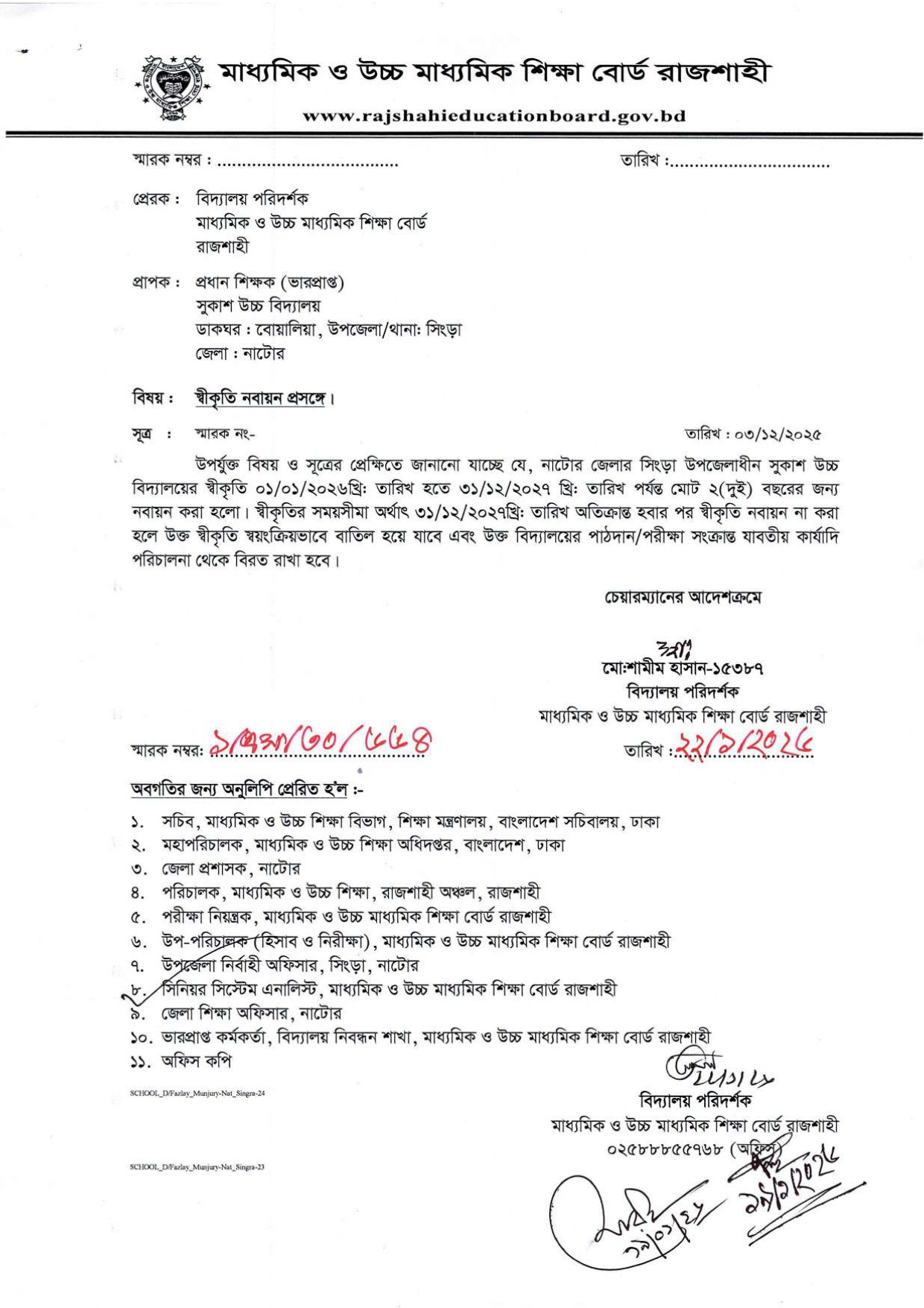নবায়ন ০১/০১/২০২৬ হতে ৩১/১২/২০২৭ পর্যন্ত।